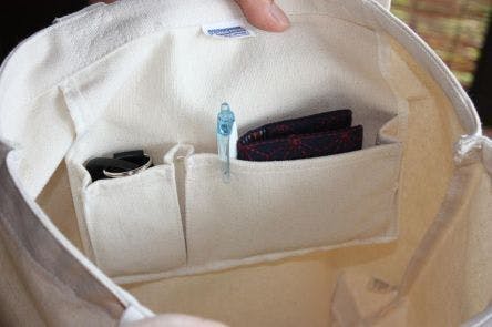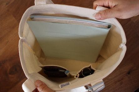 サイズは、縦35cm×横30cm×奥行10cm、A4サイズのファイルが縦にすっぽり入る大きさです。内側には財布やペン、鍵などが入るポケットもついています。