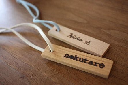 今回は特別にオリジナルキーホルダーがついてきます。サクラやカエデでつくった木のプレート(サイズ:縦8cm×横2cm×厚0.5cm)。表面にはnokutareロゴを刻印、裏面にはご希望の文字を入れてお渡しします。