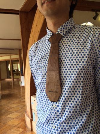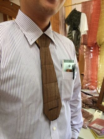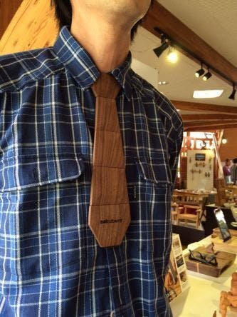 ご来場くださった皆さまから「へぇ~~、木のネクタイなんて、すごく面白い!!、けっこうカッコイイですねー!!」との御賞賛を多数頂戴、、、何名かの方に試着もしていただきました。