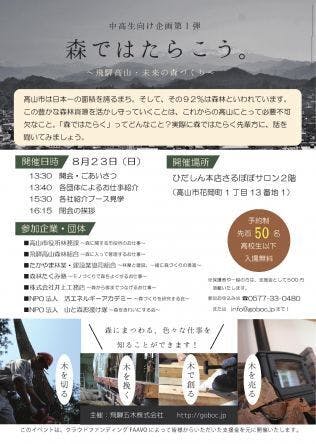 高山市役所林務課様、飛騨高山森林組合様、たかやま林業・建設業協同組合様はじめ、高山市内のNPO団体様にもご協力をいただき、「森ではたらく」ことを学べるセミナーイベントを開催いたします。
