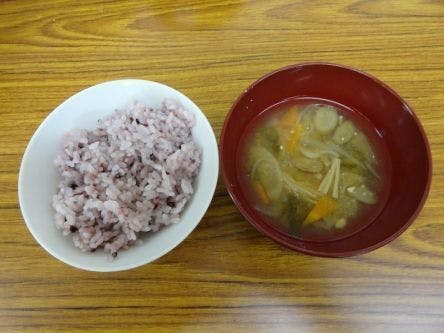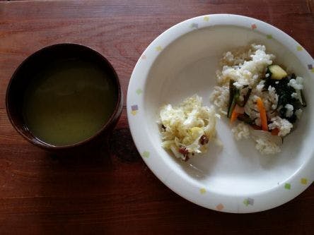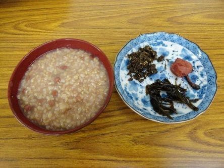 朝食(おかゆ):小豆入り玄米5倍粥、昆布の佃煮、ごぼうの佃煮、梅干