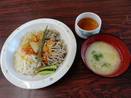 夕食:実そばのトマトソース、そうめん、そば、キヌア、塩麹漬けきゅうり、スギナの天ぷら、冬瓜と豆腐のスープ