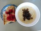 朝食:雑穀入り玄米5倍粥、牛蒡の佃煮、天然酵母パン、デーツのジャム