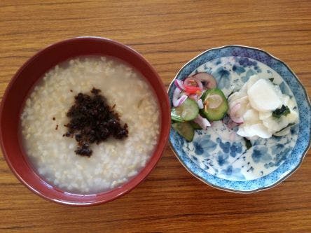 朝食:梅干し入り玄米7倍粥、糠漬け