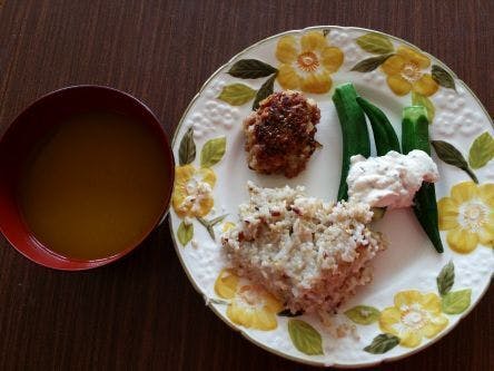 昼食:ヨモギ入り玄米ごはん、白ゴマのふりかけ、南京ポタージュ、グルテンハンバーグ、夏野菜の豆腐マヨネーズあえ