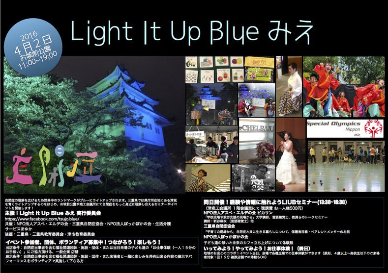 三重県では、昨年、初めて私たちが声を掛け合い、小さいながらも津城跡を青く照らすことができました。今年は、より多くの人々と力を合わせ、「自閉症」という個性と共に暮らす町を目指す気持ちを三重から世界に発信したいと願っています。