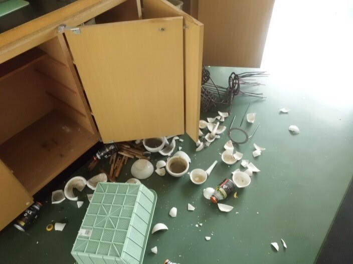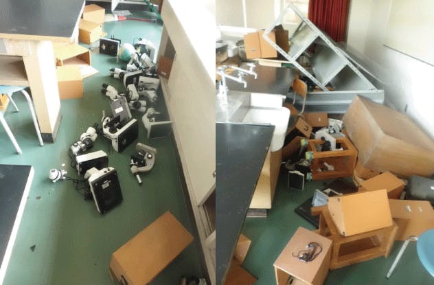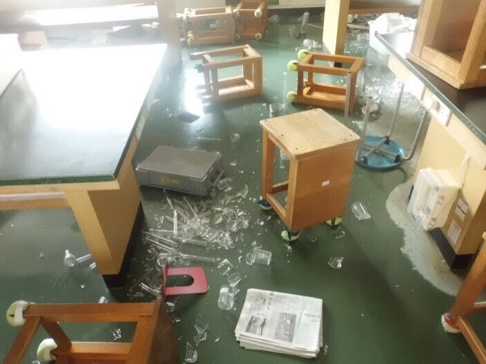 理科室の試験管、ビーカー等のガラス類、陶器、実験器具が落下し破損しました。