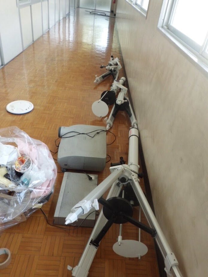 液晶プロジェクター、ブルーレイプレーヤー、などが落下や漏水によりほとんど破損、使用不能になりました。(これらの写真は被害のほんの一部です。)
