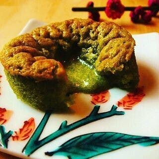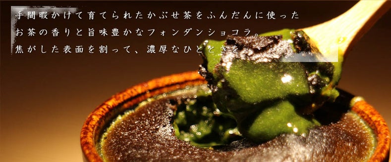 三重県四日市市水沢産の伊勢かぶせ茶を使用したフォンダンショコラ。僕の地元でもある水沢のかぶせ茶は、新芽の時期に遮光布をかぶせることによって旨味が増します。
