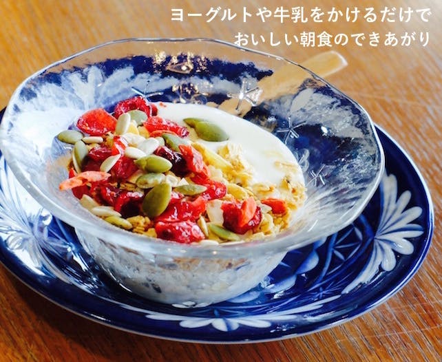 例えば、クコの実は老化防止作用のあるビタミンCやポリフェノールを豊富に含み、コラーゲンの材料物質を合成する働きもあります。またグラノーラのように白砂糖を使わないかわりに、てん菜糖や蜂蜜で軽く味付け、自然の甘みを最大限に引き出しています。