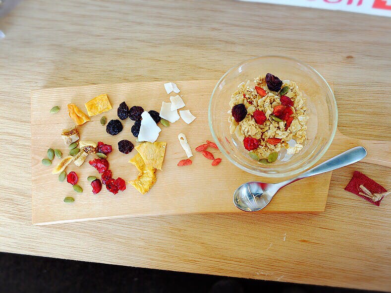 トミィスイスミューズリーは原料のオートミールに加え、アーモンド、くるみ、かぼちゃの種、ひまわりの種、エゴマ、キヌア、クコの実、白ごまをメインに様々なドライフルーツを使っています。