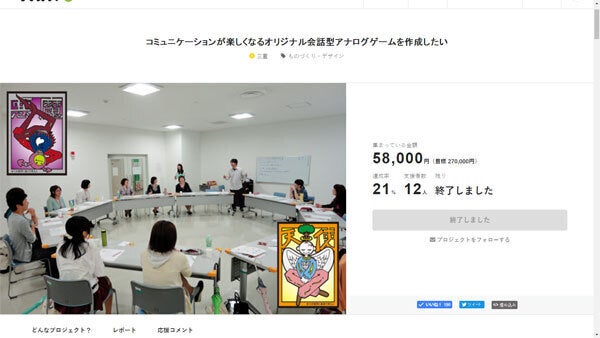 いまから2年前に同じくFAAVO三重でご支援を募ったボードゲーム作成プロジェクトでは、27万円の目標額のうち21%となる58,000円のご支援をいただき終了しました。