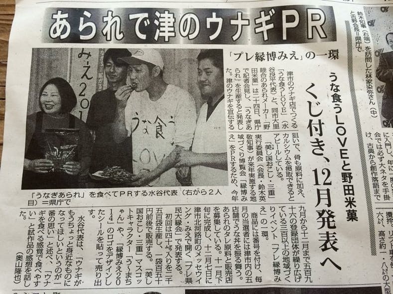 を開発しました。新しく津市のうなぎのタレを開発し、骨をたっぷり使ったあられです。さらにうなぎに繋げる為、毎月当選者を発表し、うな丼が食べれるユニークな仕掛けもつくりました。