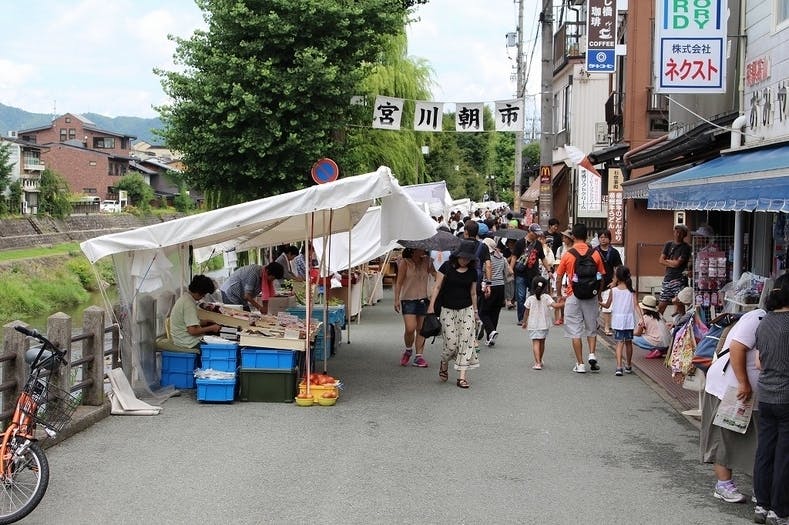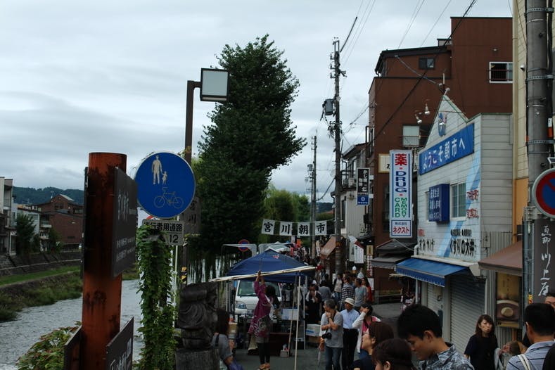 晴れの日も、雨の日も雪の日でも毎日午前7時(冬季8時)から12時まで地元の新鮮な野菜や果物、お漬物や民芸品が、鍛冶橋から弥生橋までの宮川沿いに約40店舗が並びます。