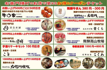 右衛門横丁内の9店舗でご利用いただけます。右衛門横丁ホームページ