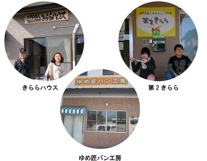 現在さんしょうの会では、3つの施設を運営しており、生活介護事業(☆)と就労継続支援B型事業(※)に取り組み、障がいのある方々の日中活動の支援を行っています。