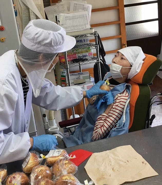 きららハウスでは、障がい者ひとり一人にあった作業内容を考え、パンのラベル貼りや座布団作りなどを行っています。作業の休憩中にはタブレットで動画を見て楽しみます。