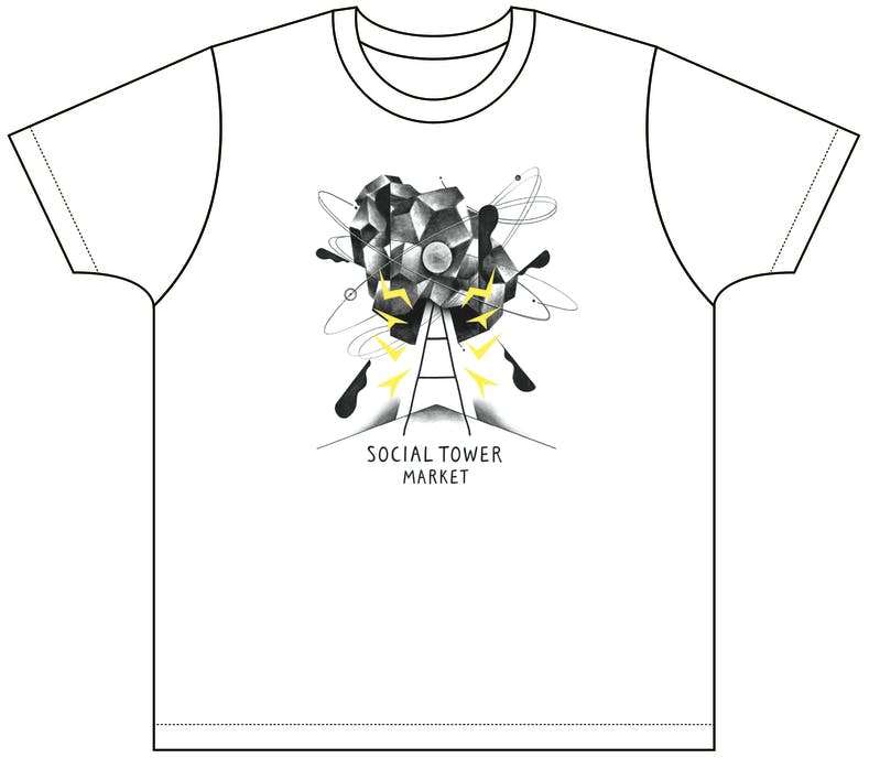 今回のクラウドファンディング・チャレンジ限定の「SOCIAL TOWER MARKET 2018」限定カラーTシャツ。今年のメインビジュアルが映えるホワイトボディを限定で制作!(スタッフ着用と会場販売Tシャツはグレーです。デザインは変更する可能性がございます。あらかじめご了承ください)