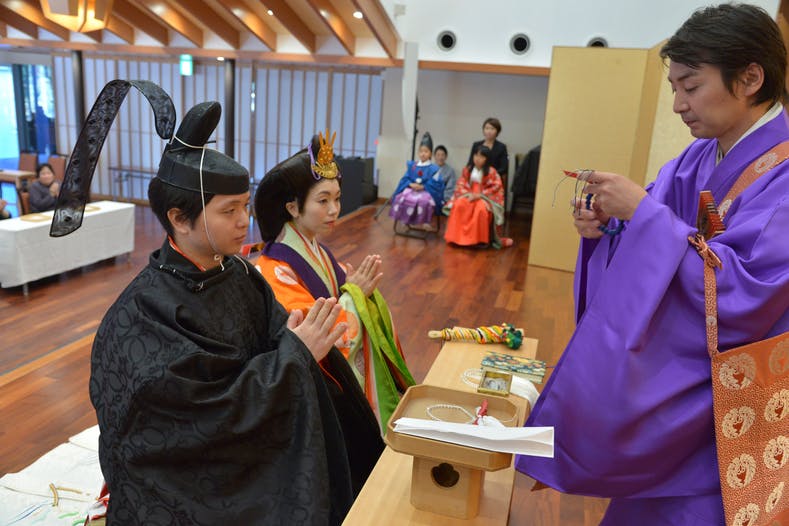 結婚式は高田会館にて仏式の結婚式を執り行ないます。新婦には十二単を纏ってもらいます。