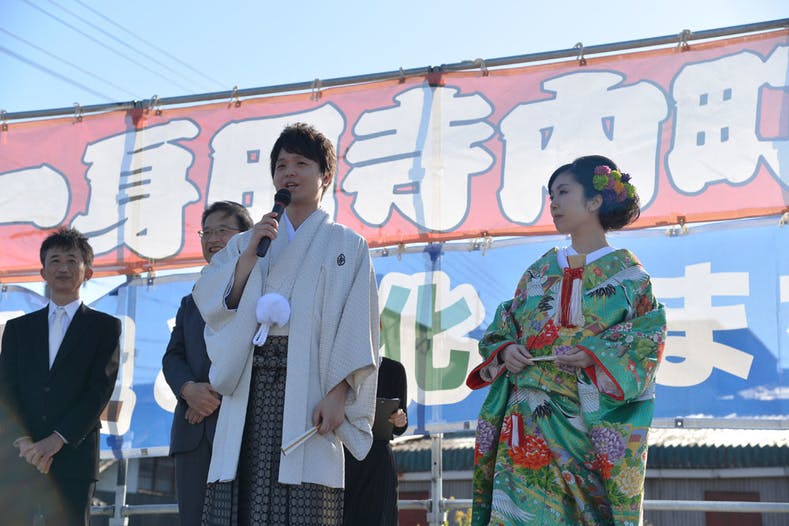その後は町内に設けた特設ステージにて、結婚の報告、町民からの祝福を受けます。