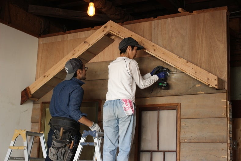 実際にゲストハウスになる物件は、大正時代から何度か改修や補強をされて現代に残る築90年を越える建物です。その建物の良さを活かしつつ、元々運営していたkabo.の物件をレスキュー(※1)し、その古材を使いながら大工の六鹿氏(KEINEN)を中心にみんなで一緒に改修をしながら、みんなで場をつくっていきます。