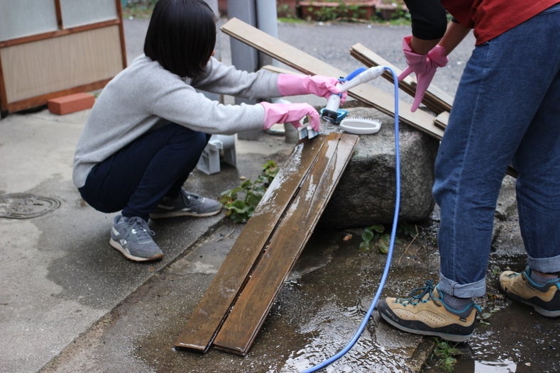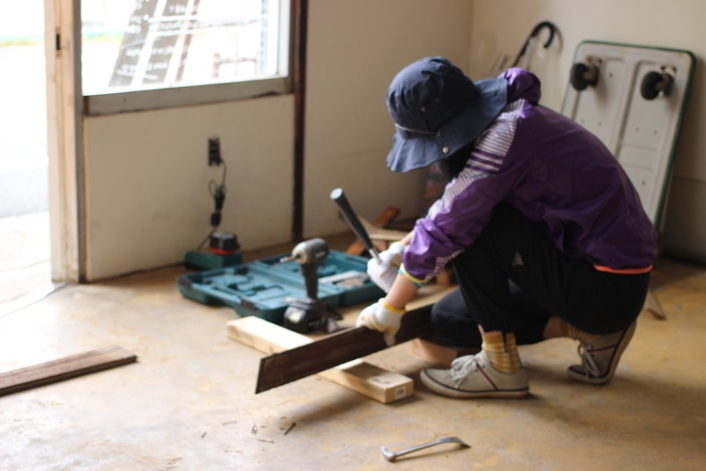 ▼レスキュー活動の様子(解体→くぎ抜き→古材を洗う作業)。