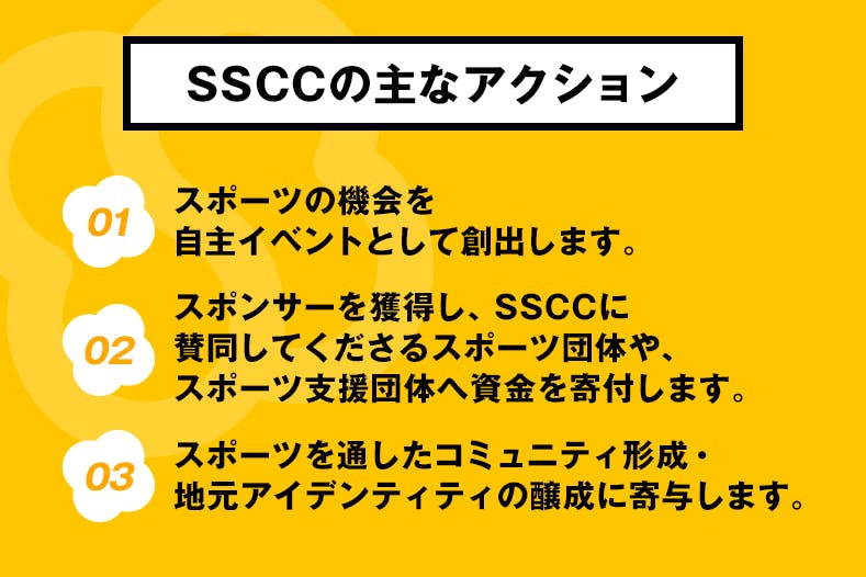 このように、部活の廃止のニュースから改めてスポーツの魅力に気付かされた私たちは、「SAVE SPORTS, CREATE COMMUNITY.(SSCC)」という団体を立ち上げることを決めました。子どもたちがスポーツに触れられる。もちろん大人も。そしてその話が広がり、コミュニティとして広がっていく。本来、街に存在していたそんな景色を未来に紡いでいきたいと考えています。そして、むしろこういった文化が日本中に根付いたらもっともっと素敵なのでは、とも感じています。