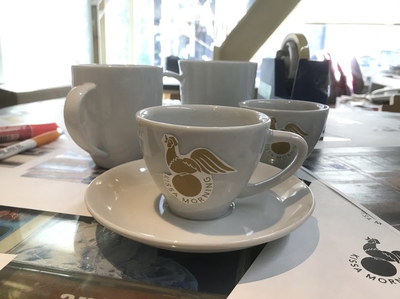 外観サインの調整の合間にも、昨日決めたカップのロゴ合わせ。ゴージャスさと、名古屋の喫茶店らしさが現れました。もうすでに1ヶ月後の出来上がりが楽しみでしょうがないです。