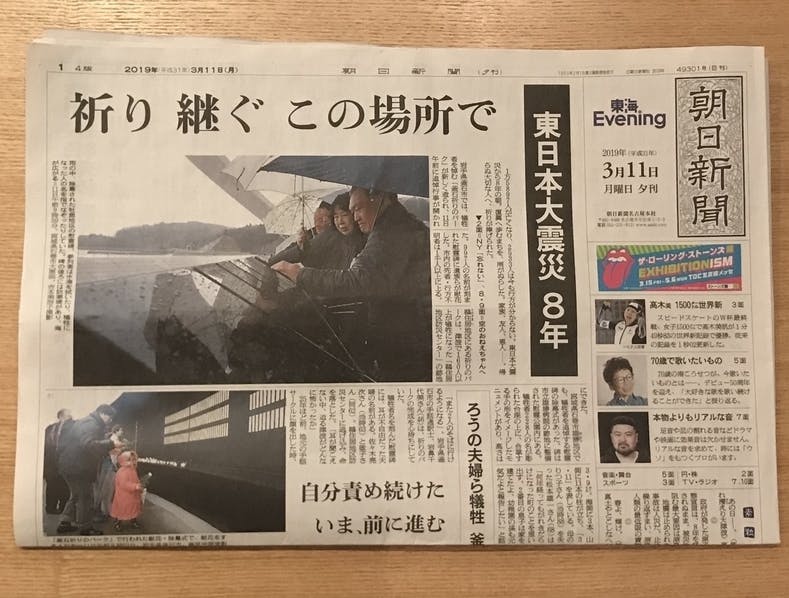 一面は、「東日本大震災8年 祈り 継ぐ この場所で」です。
