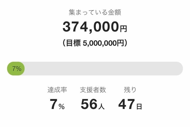 支援してくださった皆さんの数が56人まで増えました。目標は支援者数500人、合計500万円です。一人一人にこの想いが届くようにがんばります。