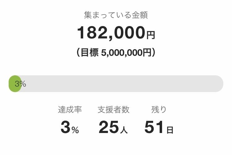 2日目で3%の達成率となり、すでに24人の方にご支援頂きました。誠にありがとうございます!!(TOT)