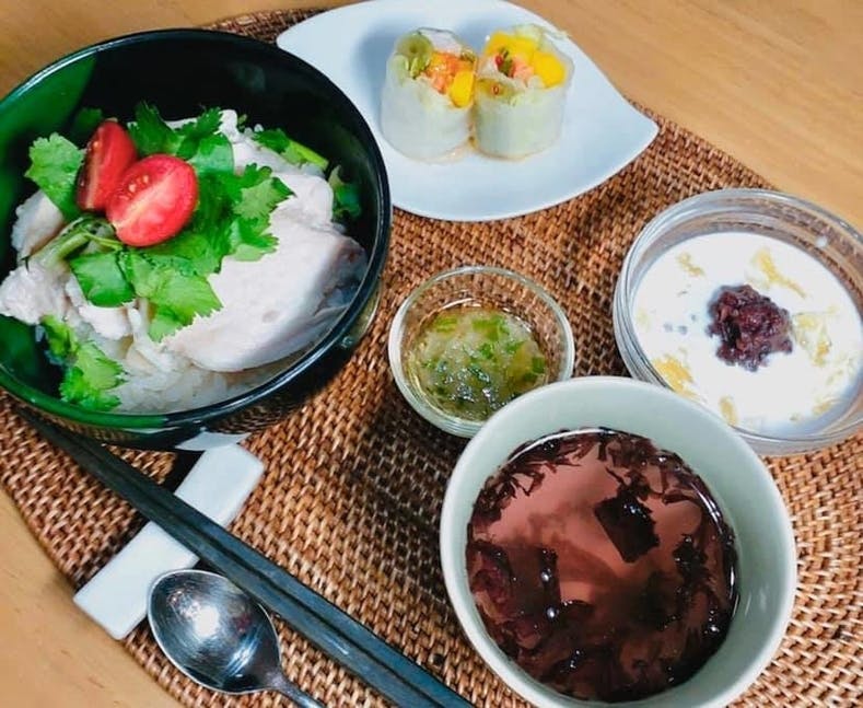 ・海南鶏飯(ハイナンチキンライス)/スープ/生春巻き/デザート(タピオカ入りココナッツミルク)