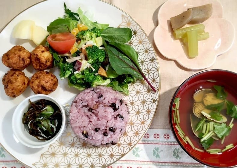 ・ランチ:旬の食材を使ったふきの煮物、あさりの吸い物、小粒黒豆入りご飯、海藻の酢の物、鶏団子の揚げ物、サラダ、フルーツ