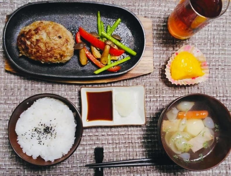 (ハンバーグソースorおろしポン酢の手作りハンバーグ/ベーコンとジャガイモのスープ/フルーツ/黒烏龍茶)