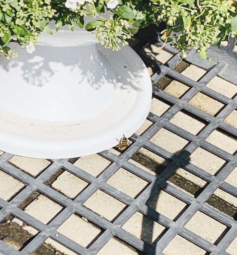 こちらは、かさでらのまちビル付近で出会ったみつばち。お花屋さんの鉢の下にあるお水を一生懸命飲んでいます。とっても可愛らしい。
