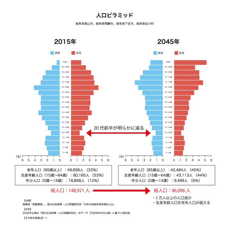 20代前半が明らかに減る構造が可視化されたと同時に、2045年には人口が約5万人減少し、生産年齢人口(15歳〜64歳)の割合を老年人口(65歳以上)が上回ることが判明しました。