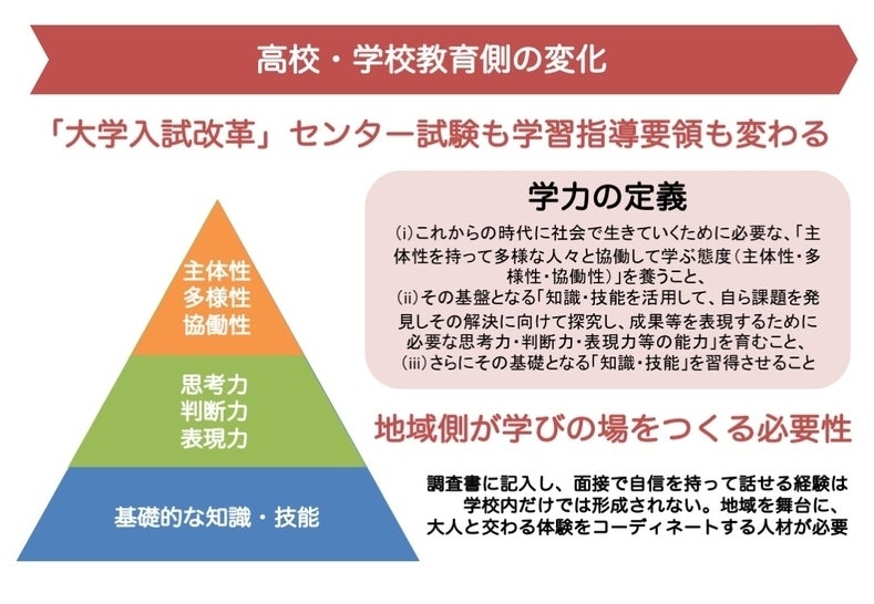 2020年からセンター試験は廃止され、「思考力・判断力・表現力」を一層重視するものに変わり、それに合わせて先生たちの指導方針となる学習指導要領も新しく策定されます。「学力」の定義も大きく変わり、「課題解決能力」や「主体的に学ぶ姿勢」、加えて大人たちと「社会で協働した経験」が大学入試で問われることになるのです。