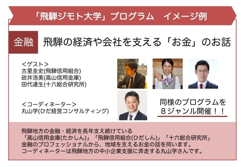 例えば「金融」の座談会では、飛騨地方の経済を担う各金融業界の最前線で活躍する飛騨人にご登壇いただき、地域のお金や未来のお話をしていただきます。