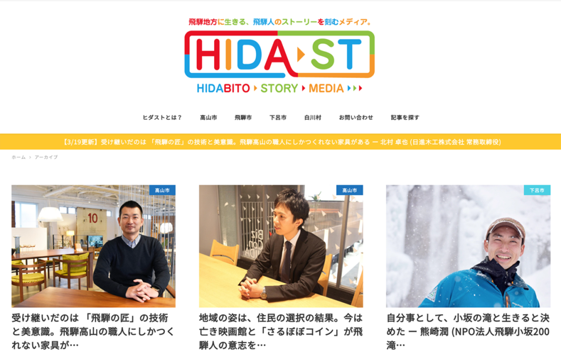しかし、高校生が初対面の大人といきなり深いお話をするのは難しい・・。そこで活用したいのが、飛騨人の半生や価値観を取材し、記事化しているメディア「ヒダスト」です。(事務局のゴーアヘッドワークスが昨年8月から運営しております)