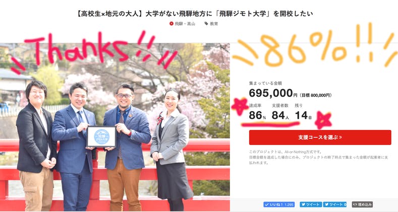 本当にありがとうございます!支援者の数も84人と、本当に多くの方に応援いただきとってもうれしいです。