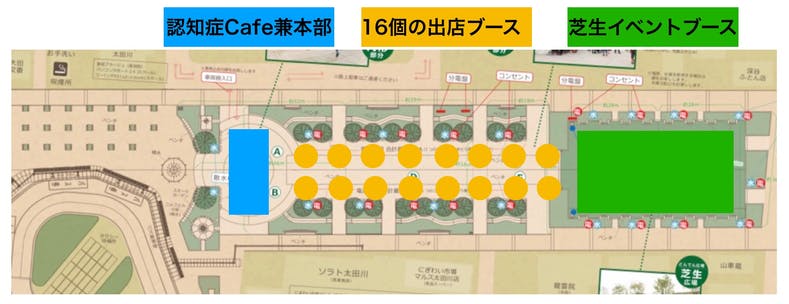 認知症cafeとイベントブースを繋ぐ大きな道の脇に16個の出店ブースを設けます。