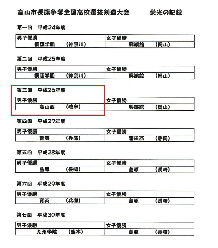 第1回開催の男子優勝:桐蔭学園(神奈川)女子優勝:興譲館(岡山)から始まり、第3回大会では、地元である高山西高校の男子剣道部が優勝した実績もあります。