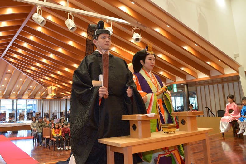 結婚式は高田会館にて仏式の結婚式を執り行ないます。新婦には十二単を纏ってもらいます。