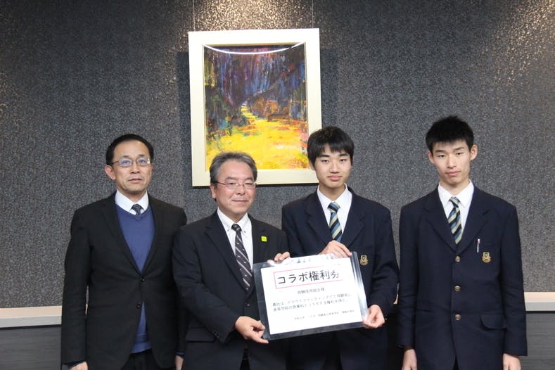2019/12/30 15:31飛騨信用組合様から¥30,000コースを支援していただきました。30,000円コースのリターンは、来年度に飛騨高山高校とコラボプロジェクトを実施できる権利を得る券です。 先日、飛騨信用組合様へ伺い、そのコラボ権利券をお渡してきました。 写真がその様子です。 (左から、担当の先生、飛騨信用組合ブランド戦略部部長、僕たち) 今回クラウドファンディングを行ったメンバーは全員が3年生です。実際にコラボすることが出来ず残念ですが、後輩たちに引き継いていき、有意義なコラボプロジェクトが実行されることに期待します。 再びクラウドファンディングを実施するのか、飛騨信用組合様が推し進めるさるぼぼコインを活用するのか、、、どういう内容になるかは来年度をお楽しみに! もっと見る