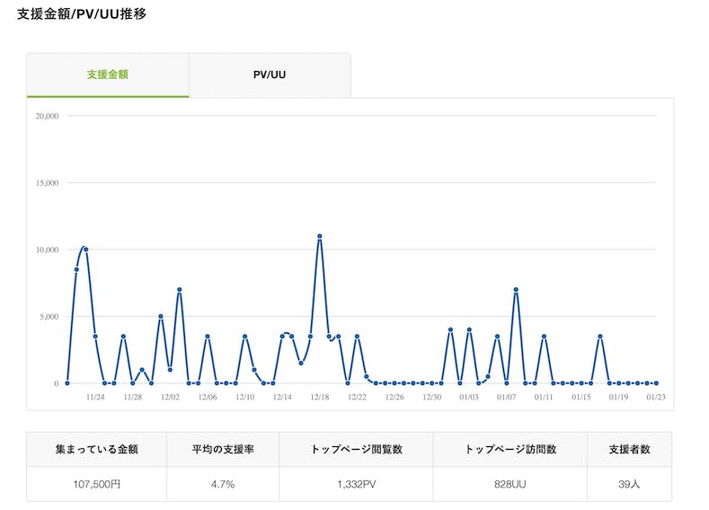 あと、TOPページの画像を細かく更新しているんですが、画像を変え始めた1月5日〜1月17日の約2週間で、18,000円のご支援をいただいています。