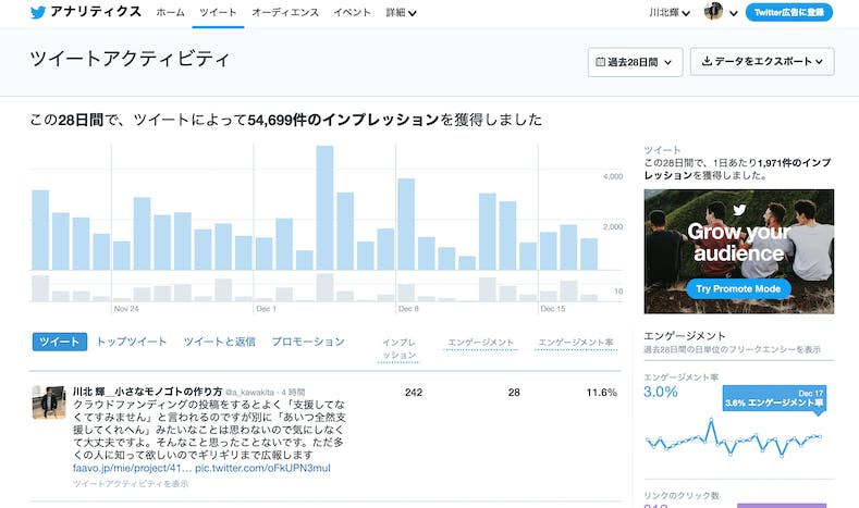 ちなみに、最新のデータによると、僕のTwitterは最新の28日間で54,699件のインプレッション数(閲覧数)で、1日平均1,971件のインプレション数(閲覧数)とのことです。