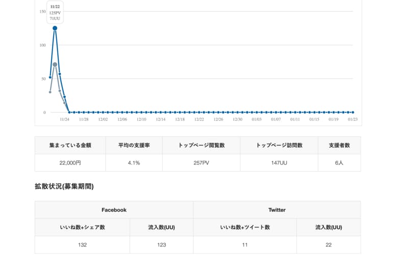 その時と比べ文章を書いている途中に保存する「自動保存」や、目標額に届かなくても集まった額の80%を受け取れる「All in」など新しい機能が増えてきていましたが、訪問者数などのデータも見られるようになっていました。