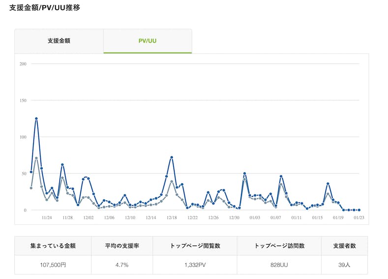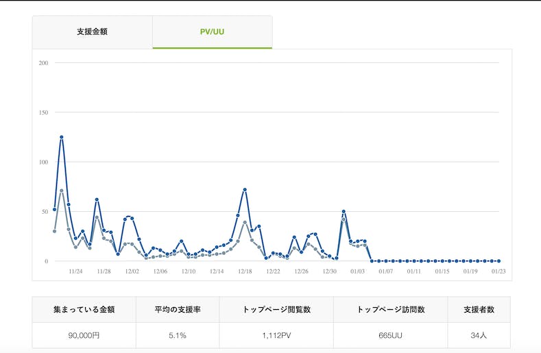 こんにちは。川北です。 長かったこのクッキープロジェクトもラスト3日となりました。 小さなクラウドファンディング勉強会から始まったこのプロジェクト。 みなさまのおかげで、目標としていた3万円を超え、勉強会の参加者だった「パティシエプロジェクト」と「チョコレートワークショップ」の金額も超え、講師としても参加者としても、なんとか1つの形になりました。 本当にありがとうございます。 そして残された日にちでやることは、このレポートのタイトルにもなっている「支援者40人」に向かうことです。 いま現在のプロジェクト閲覧数は次のようになっています。 TwitterやFBで呼び掛けた時は、ピョコピョコっと竹の子のように閲覧数があがります。 で、それに伴って 支援者数もピョコピョコと竹の子のように増えます。 グラフを重ねるとぴったり一致するわけではないですが、おそらく、プロジェクトが目に留まる → 考える → 支援するという流れになるので、1日〜2日のタイムラグは発生するのではと推測しています。 また、銀行振り込み、コンビニ払いだとさらにズレが生じます。 ただ、愚直にタイミング広報し続ける。 それを見て支援をしていただく人がいる。 ということには変わりないので、ただただ愚直に広報していくというのは大切なことだなと再確認できました。 もちろん効率よく、効果的に広報できることが一番なのですが、それができない期間でも何かしら発信していくことは大切ですね。 あと、TOPページの画像を細かく更新しているんですが、画像を変え始めた1月5日〜1月17日の約2週間で、18,000円のご支援をいただいています。 全体の17%ぐらいを2週間で支援いただいているので、多少は効果があったのかなと思っています。 また、画像を更新していくことで、TwitterやFBに投稿するときの素材として使うことはいいですね。 残り3日。 あとは広報しまくっていくだけなので、40人目指してがんばります! そして40人目標を達成したあとのこともあるので、久しぶりにFAAVO三重のランキングも掲載しておきます。 ランキングは現在のこのプロジェクトの位置とその3つ上を掲載します。 【FAAVO三重 支援者数ランキング】 7位 支援者数:46人 震災で壊れてしまった中学校を援助して熊本の未来を助けたい! 7位 支援者数:46人 高田本山国宝化、おもてなしゆるキャラ「しん坊」くんリニューアルしたい! 9位 支援者数:42人 学童軟式野球チーム『高岡コンドルズ』を応援してください! 10位 支援者数:39人 生産者と料理人の化学反応!三重の食材を全国の人に食べてほしい! 10位 支援者数:39人 お酒に合う「おつまみクッキー」を食べて、障がい者雇用促進を応援したい! 【FAAVO三重 支援金額ランキング】 31位 支援金額:142,500円 【緊急支援】がんばろう熊本!熊本復興への支援金募集! 32位 支援金額:133,000円 みんなで祝おに!「平成29年度 一身田しあわせ和婚」 33位 支援金額:111,000円 みんなで祝おに!「平成28年度 一身田しあわせ和婚」 34位 支援金額:107,500円 お酒に合う「おつまみクッキー」を食べて、障がい者雇用促進を応援したい! 【FAAVO三重 達成率ランキング】 1位 達成率:1425% 【緊急支援】がんばろう熊本!熊本復興への支援金募集! 2位 達成率:358% お酒に合う「おつまみクッキー」を食べて、障がい者雇用促進を応援したい!