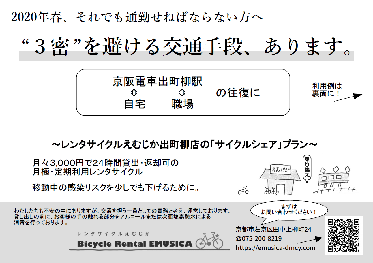 京都市左京区、京阪電車・叡山電車の出町柳駅近くで、「レンタサイクルえむじか出町柳店」を運営するサイクルアンドミュージック株式会社代表の柴山と申します。