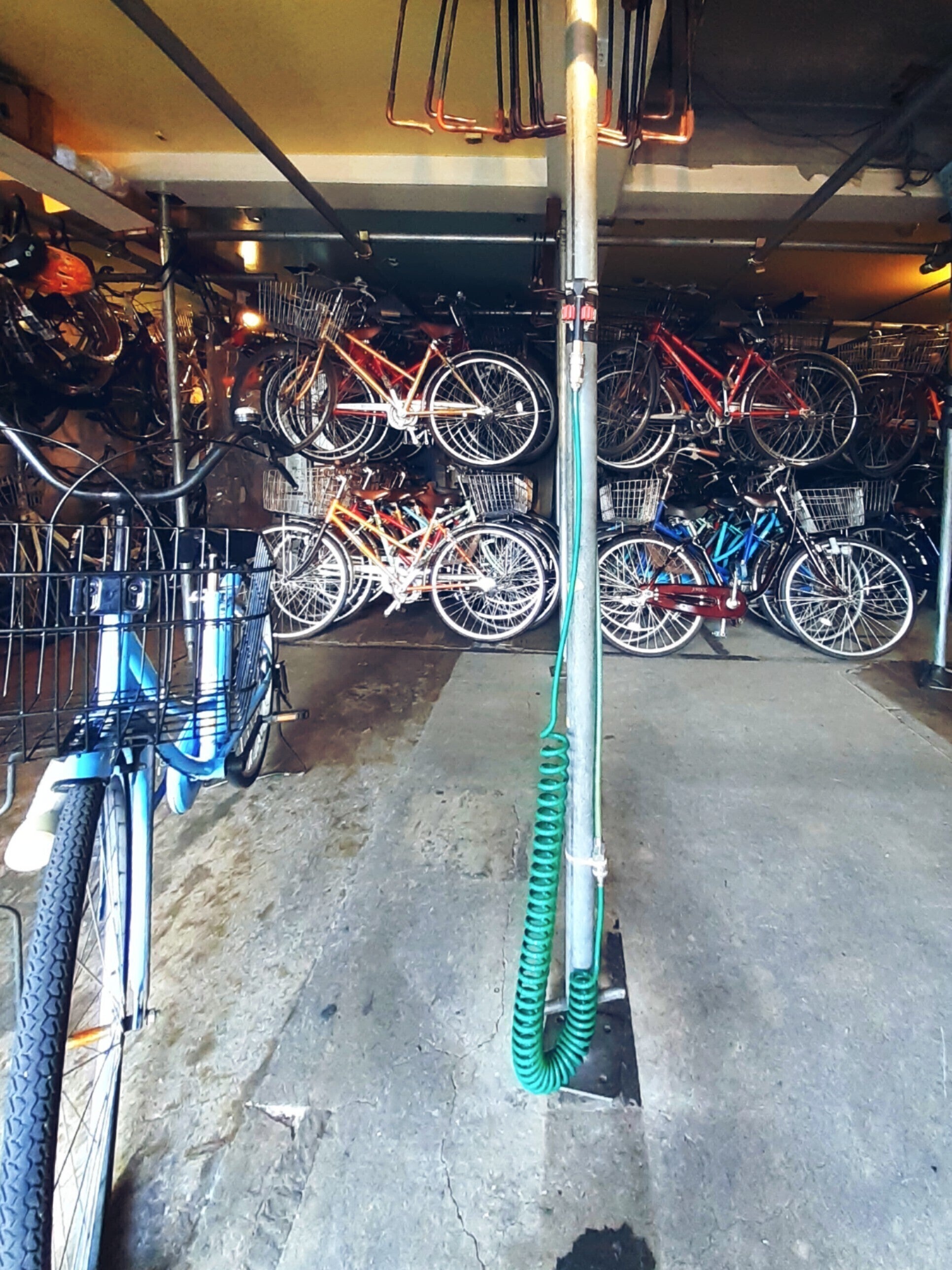 返却ラッシュと貸し出しラッシュの狭間、自転車たちが集まる朝8時のえむじかはぎゅうぎゅう詰め。普通の駐輪場と比べれば、店内に出入りのための通路はナシ、隣の自転車との隙間もナシ。オリジナルハンガーで2段収納、奥からキュッと整列。手前の自転車から使えばいいレンタサイクルだからこそ、駅前の小さな店でコンパクトに運営しています。